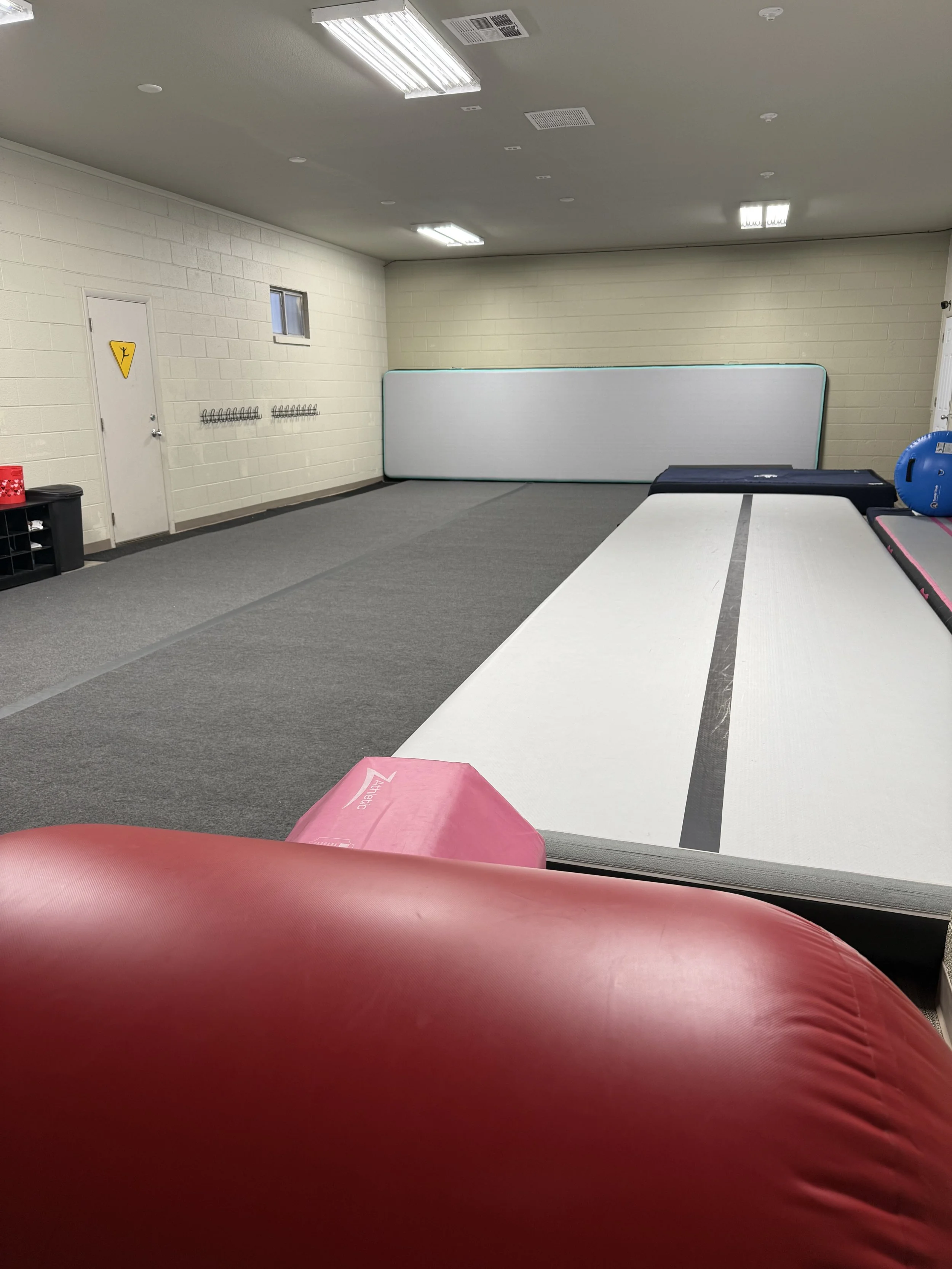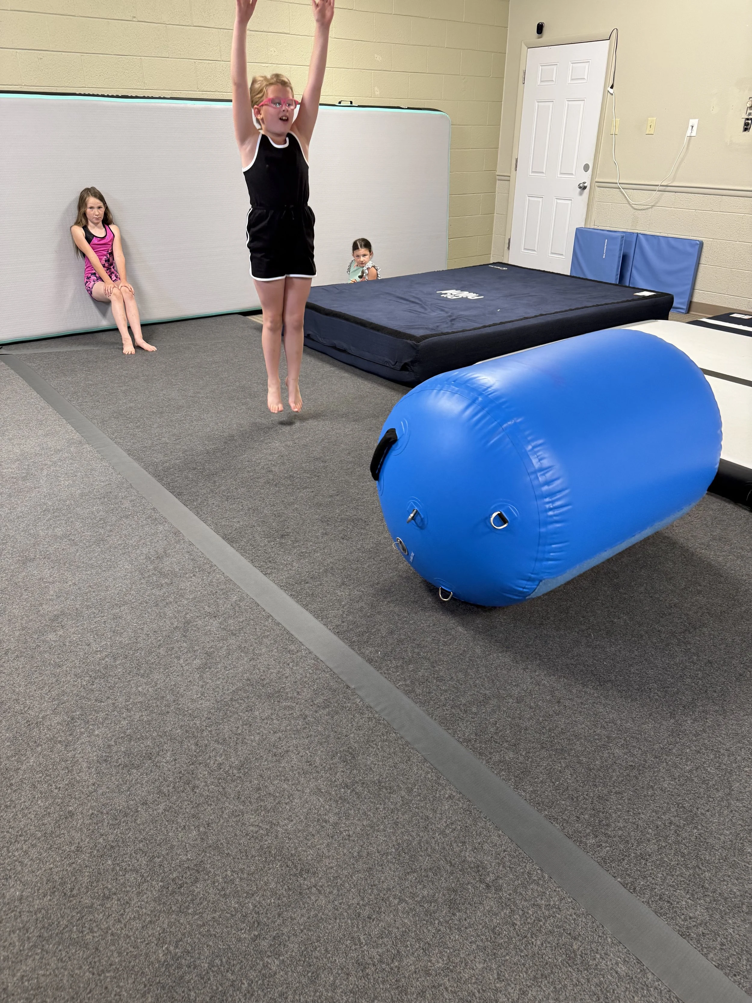 Back extension roll to plank, Handstand blocks and snap downs, 1 handed cartwheel L & R, power round off, back walkover, front walkover, various walk over combinations